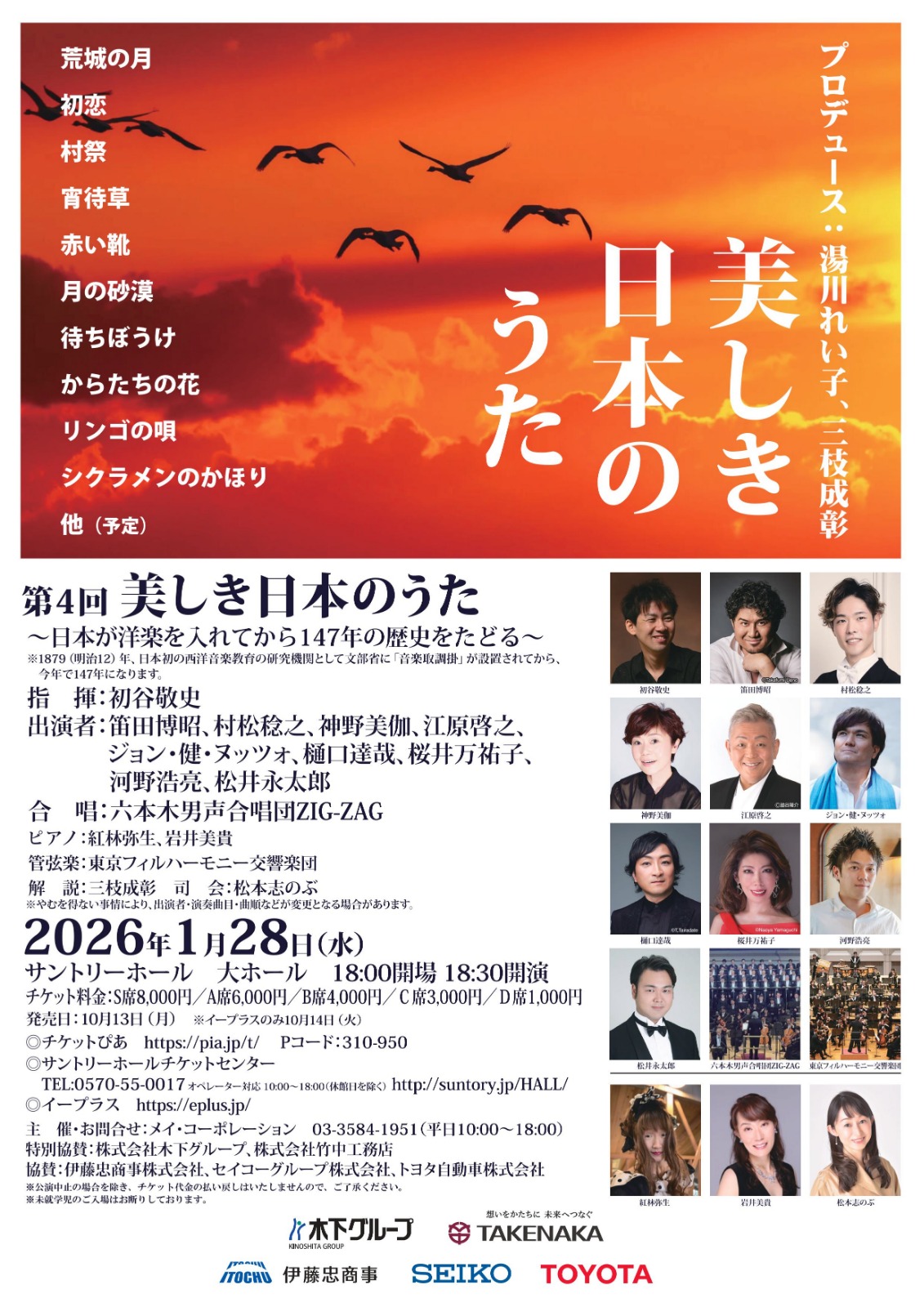 出演 | 指 揮:初谷敬史 出演者:江原啓之、神野美伽、桜井万祐子、村松稔之、ジョン・健・ヌッツォ、樋口達哉、笛田博昭、河野浩亮、松井永太郎、ほか 合 唱:六本木男声合唱ZIG-ZAG ピアノ:紅林弥生、岩井美貴 管弦楽:東京フィルハーモニー交響楽団 解説:三枝成彰 司会:松本志のぶ ※出演者は変更になる場合がございます。あらかじめご了承くださいませ。 |
