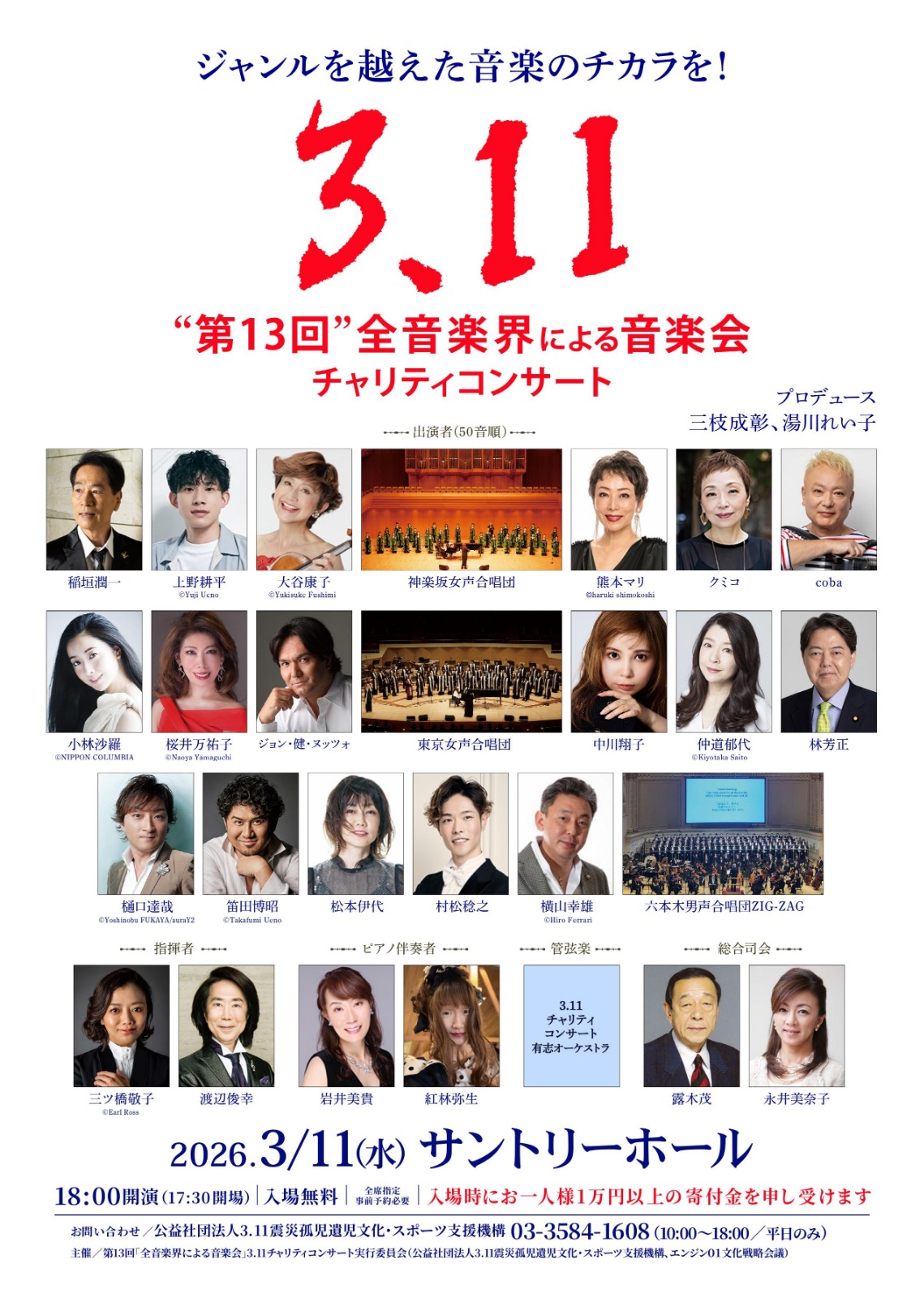 | 主催 | 第13回「全音楽界による音楽会」3.11チャリティコンサート実行委員会(公益社団法人3.11震災孤児遺児文化・スポーツ支援機構、エンジン01文化戦略会議) |